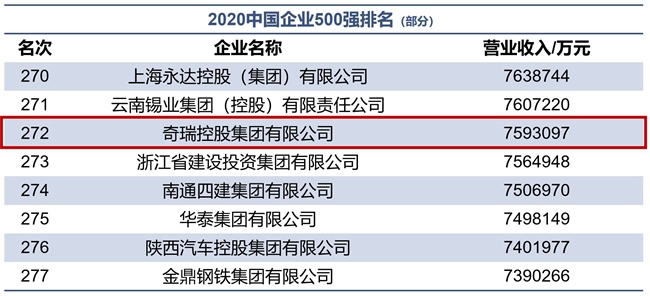 9月28日,在2020中国500强企业高峰论坛上,中国企业联合会、中国企业家协会第19次向社会发布“中国企业500强”榜单。奇瑞控股集团有限公司连续第三年跻身榜单,以759.3亿元的营业收入,位居排行榜第272位,在上榜的9家安徽企业中位列第三。