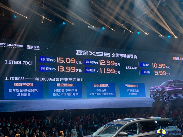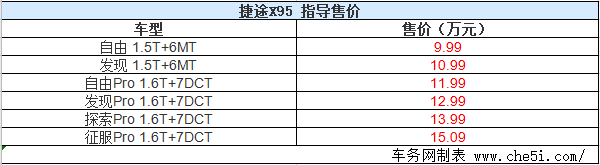 2019年11月28日,捷途X95正式上市,新车共推出6款配置车型,售价区间为9.99-15.09万元。捷途X95定位为中型SUV车型,可提供5座/6座/7座车型供消费者选择。详细请看下表。此外,购买新车的前10000名用户还可享受整车终身质保、终身基础保养、终身基础流量、36期0利率或5年超长贷款、不限品牌最高20000万元置换补贴以及5年无限量娱乐流量等后期和金融优惠政策。
