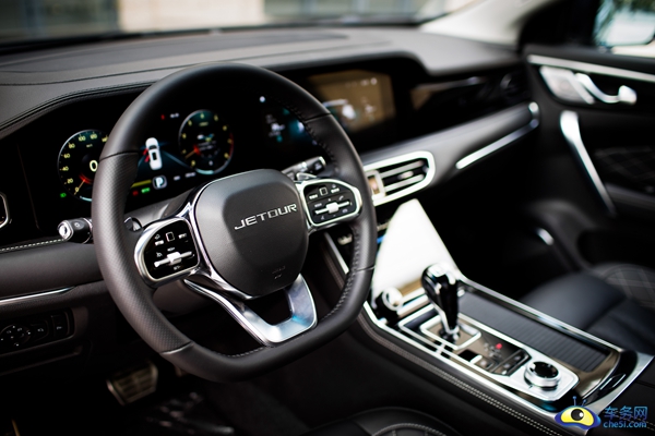捷途X95采用了家族式设计风格,贯穿式双屏的设计是当下比较流行的设计,整体内饰看上去大气简约,并加入了钢琴烤漆饰版及银色镀铬条加以点缀。中控台采用大面积软性材质进行包裹,不仅有着良好的触感,也提升了内饰的质感。中控屏与仪表盘两块12.3英寸的屏幕并列放在一起,再加上地台前方的液晶空调控制区域,科技感十足。当然,有图案的装饰板、银色金属饰条以及大量软性材质的使用让车内也富有质感。