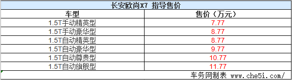 2019年11月29日,长安欧尚汽车旗下全新紧凑型SUV—长安欧尚X7在北京人民大会堂正式上市,新车共计推出6款车型,指导售价区间为7.77-11.77万元,太空珍藏选装包定价10000元,详细请看下表: