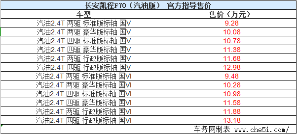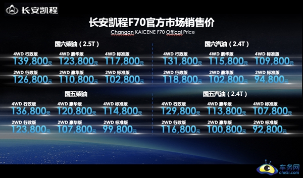 2019年10月28日,长安轻型车官方宣布旗下全新皮卡车型——长安凯程F70正式上市,新车共推出24款车型,官方指导售价为9.28-13.98万元。据悉,由长安轻型车与PSA集团合作打造的凯程F70。动力系统部分,新车分别搭载2.4T汽油发动机及1.9T和2.5T柴油动力发动机,并匹配6速手动变速箱。同时官方推出4年或20万公里质保、整车交付/合格证交付/保养时间/维修时间标准化、原厂配件保障、专业线上咨询等服务政策。未来竞争对手将会是长城炮、大通T70等。详细请看下表: