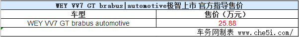 2020年7月16日晚,WEY VV7 GT巴博斯版正式上市,本次上市新车共推出1款车型且全球限量300台,售价为25.8万元。新车作为WEY品牌与全球最大、世界顶级个性化定制品牌——brabus|automotive跨界合作的首款全球化高端定制车型,通过对外观和内饰的重新演绎,外观增加了更运动的套件,车内通过更大胆的颜色搭配以及运动座椅。动力方面,新车继续搭载与普通版VV7 GT相同的2.0T发动机,与之匹配的是7速双离合变速箱。具体价格见下表: