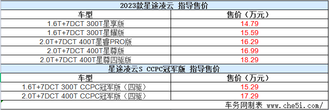 2022年9月6日,星途旗下新款凌云车型正式上市,新车共推出5款车型,售价区间14.79-18.29万元。同时,此次还公布了星途凌云S CCPC冠军版的售价,共推出2款车型,售价区间为15.29-17.29万元。新车是基于星途M3X火星架构PRO打造,前身是星途TXL改名而来。2023款车型的外观内饰变化不大,但在配置等方面进行了升级优化。新增11项升级,外观新增颜色,增加女王座驾等。新车定位中型SUV,搭载1.6T与2.0T两款涡轮增压四缸发动机。
