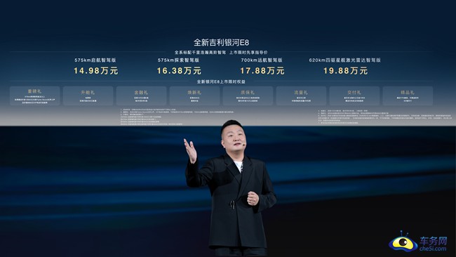2025款银河E8共推出4款配置车型,限时先享指导价为14.98-19.88万元,具体如下: