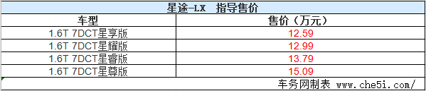 2019年10月19日,EXEED星途全新紧凑型SUV——EXEED星途LX在北区正式上市,新车推出一种排量共计4款车型,售价区间为12.59-15.09万元。作为EXEED星途打造的第二款车型,EXEED星途LX采用了家族式设计语言,EXEED星途LX搭载一台1.6TGDi发动机。与此同时,官方还推出购车尊享礼包以及首批1000名车主专享礼包等政策。详细售价请见下表: