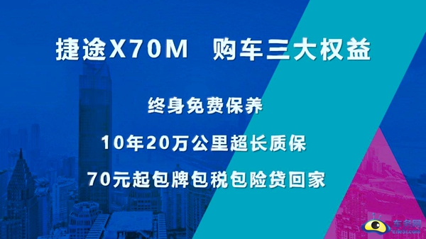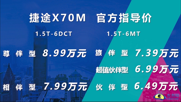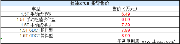 2020年3月23日,捷途X70M正式上市。新车共推出5款车型,指导价格区间为6.49-8.99万元。作为捷途X70系列的新成员,捷途X70M的推出进一步降低了捷途X70系列的售价门槛,自身竞争力得到了进一步提升。此外,官方将提供终身免费保养(截止2020年6月30日前购车)、整车10年/20万公里质保、发动机10年/100万公里质保。详情见下表: