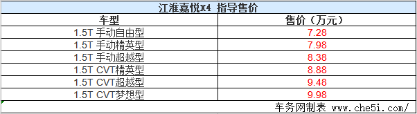 2020年6月27日,江淮乘用车3.0时代首款小型SUV——嘉悦X4正式上市,新车共推出6款车型,提供6款外观颜色和2种内饰风格可选,官方指导价7.28-9.98万元,现金钜惠10000元,客户实际优享价6.28-8.98万元。嘉悦X4的外观采用最新家族设计语言,并配备了10.25英寸液晶仪表以及10.25英寸的中控大屏,动力方面全系搭载1.5T CVT/6MT动力组合,0-60km/h加速仅4.3秒。此外,江淮乘用车还为够买新车的用户享受10000元现金优惠、提供最高5000元金融补贴、2000元置换补贴、每月5G终身流量、5年20万元质保等购车礼遇,诚意十足。详情请见下方表格: