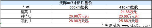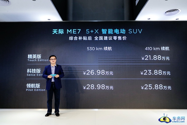 2020年9月19日,ENOVATE天际汽车首款产品5 X智能电动SUV—天际ME7在上海 正式上市,新车推出530km、410km 2个NEDC续航版本共5款车型,综合补贴后售价21.88-28.98万元。另外,新车采用官方定义的“先锋重构美学”设计理念打造,内部打造以五屏互联为基础的智能座舱,科技感十足。同时其位于上海静安商圈的全球首家天际中心同步正式营业。详情请看下表: