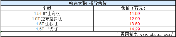 2020年9月25日,北京车展前夕,哈弗全新紧凑型SUV--哈弗大狗正式上市,新车共推出4款车型,官方价格为11.99~14.29万元,新车和全新第三代哈弗H6同“柠檬”平台打造, 使用承载式车身,定位于城市越野SUV。新车搭载1.5T涡轮增压发动机,最大功率169马力,传动方面匹配7速双离合变速箱。此外,官方也发布了一系列优惠政策,详情见下表图表: