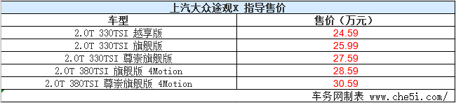 2020年11月9日,上汽大众途观X正式上市,共推出5款车型,售价区间为24.59-30.59万元。途观X新车外观采用了Coupe造型设计,看上去更为时尚动感,全系采用R-Line外观套件。动力方面,途观X搭载高低功率版本2.0T发动机,最大功率分别为137kW(186马力)和162kW(220马力)。详情请见下图: