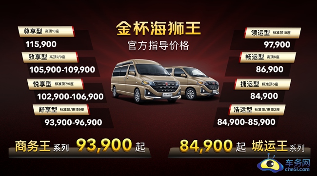 11月24日,华晨雷诺金杯合资后首款LCV产品——金杯海狮王在沈阳工厂迎来上市,全新金杯海狮王分为城运王和商务王两大系列,城运王系列售价为84,900元-97,900元,商务王系列售价为:93,900元-115,900元。