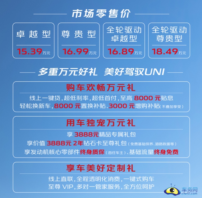 2021年3月28日,长安UNI-K正式上市,新车搭载2.0T 8AT动力组合,提供两驱和四驱版本,共推出四款车型,售价区间为15.39-18.49万元。长安UNI-K定位中型SUV,是UNI系列的第二款车型。动力系统将搭载全新一代蓝鲸2.0T发动机。详细售价请看下图表: