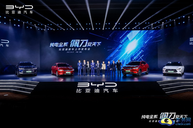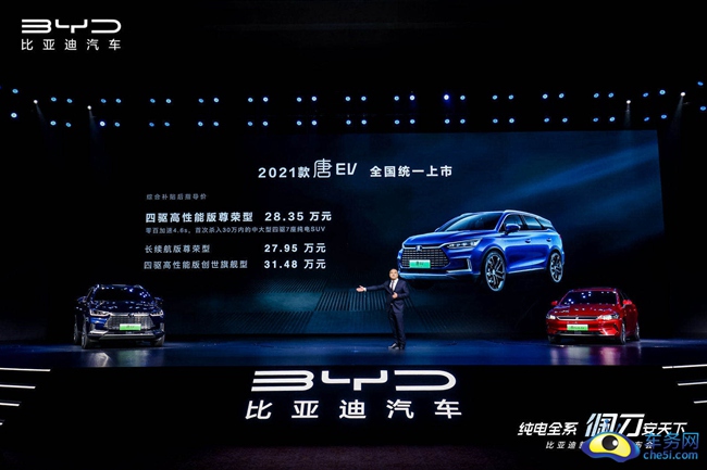 2021年4月7日,比亚迪在重庆会展中心举办新车上市发布会,2021款秦PLUSEV、宋PLUS EV、唐EV和e2四款车型全面切换搭载刀片电池上市,其中2021款秦PLUS EV综合补贴后价格为12.98-16.68万元、宋PLUS EV综合补贴后价格为16.98-18.68万元、唐EV综合补贴后价格为27.95-31.48万元、2021款e2综合补贴后价格为9.98-11.58万元。四款车型综合补贴后售价区间为9.98-31.48万元,详细价格请见下表。此外,比亚迪还宣布即日起,旗下所有车型将搭载磷酸铁锂刀片电池。