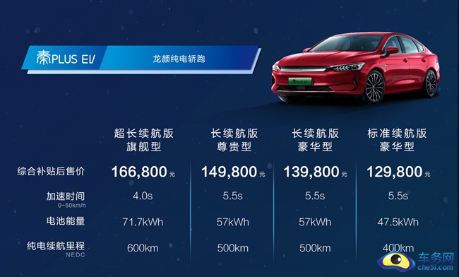 小结:秦PLUS EV作为一款龙颜纯电轿跑,延续大放异彩的EV Dragon Face设计语言,龙须飞扬、龙睛锐利。游龙跃动腰线搭配龙腾溜背造型,整体线条饱满灵动,宛如游龙,气势磅礴。佩刀而来的秦PLUS EV以快和远,成为同级车中的性能表率,同时摆脱了里程束缚和充电焦虑。0到50公里加速快至4秒,远超同级的600km超长续航,百公里电耗低至12.9kWh。充电一次、通勤两周。30分钟直流快充,电量即可从30%充至80%。秦PLUS EV综合补贴后价格为12.98万元-16.68万元。