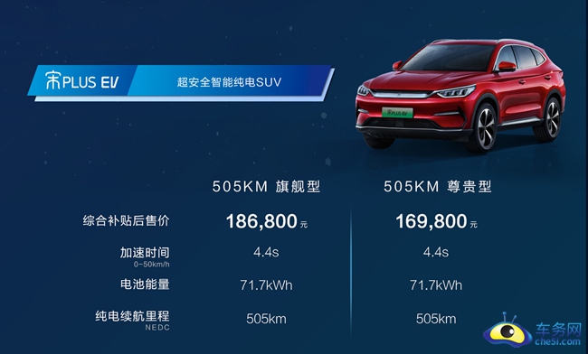 宋PLUS EV是比亚迪宋家族的第四款产品(前三款分别是宋、宋MAX以及宋Pro),定位为紧凑型SUV。此次上市的宋PLUS EV是它的纯电动版本,共推出了两款车型,综合补贴后售价分别为16.98和18.68万元。新车采用家族设计语言,动力方面将配备刀片电池,并推出405公里和505公里两种续航版本供选择。