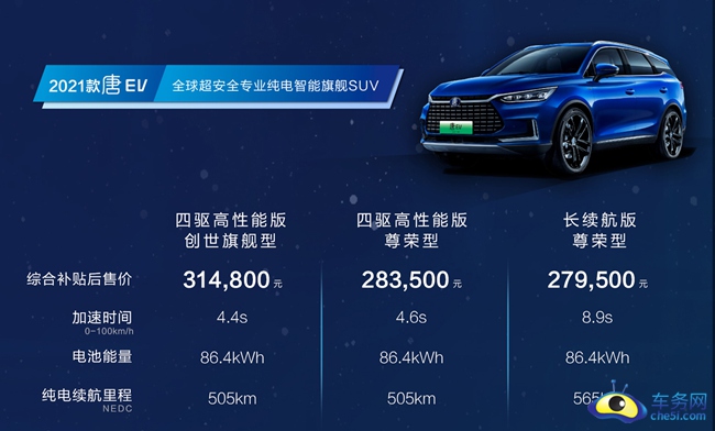 小结:2021款唐EV除了“带刀”升级外,还拥有“五星安全”和“三项全优”双重认证,是全球超安全专业纯电智能旗舰SUV。2021款唐EV零百加速4.4秒,制动距离34.5m,续航里程565km,充电10分钟可跑118km,是当之无愧的“性能猛兽”。它同时搭载更懂用户的人机交互,更人性化的智能空间,给用户全方位的智能领航。2021款唐EV此次更加推四驱高性能尊荣型,零百加速仅为4.6秒,成为首款杀入30万内的中大型四驱7座纯电SUV,综合补贴后价格为27.95万元-31.48万元。