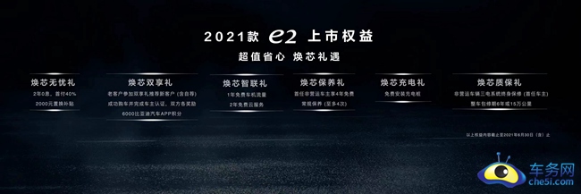 此次发布会上2021款比亚迪e2车型也宣布上市。比亚迪e2是在现款车型的基础上换装了磷酸铁锂刀片电池,共推出了两款车型,综合补贴后售价区间为9.98-11.58万元,新车的设计与在售车型基本保持一致。2021年6月30日(含)前购买比亚迪e2的用户,还可享受首付40%起2年0息购车、置换补贴2000元、首任非运营车主4年免费常规保养(至多4次)、1年免费车机流量、2年免费云服务、免费安装充电桩等优惠政策。
