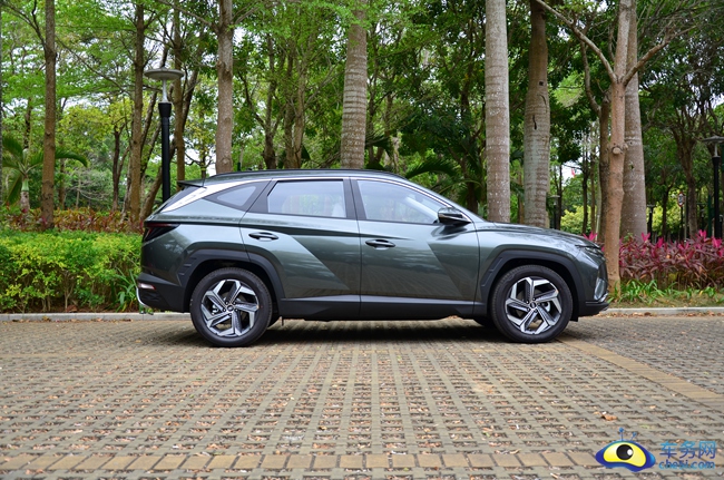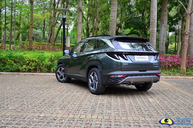 车身侧面采用平直锐利切割式线条设计,勾勒出了极具力量感的三维立体的效果。犀利的腰线从前门把手处一直延伸至尾部,结合银色饰条装饰,形成大方又高级的整体形象。隐藏式的B/C柱设计,搭配非圆弧轮眉以及轮眉护板上的导气凹槽,使整体车身更显刚毅。北京现代第五代途胜L的车身尺寸为4670/1865/1690mm,轴距达到了2755mm。仅从数据上,第五代途胜L在车身宽度和轴距数据上已经达到了同级领先水平。19英寸五辐式双色旋转铝合金轮毂非常有设计感,整体看上去就非常运动。轮胎规格为235/55 R19,品牌为耐克森。