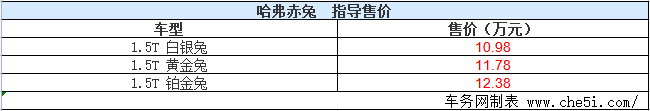 2021年5月20日,长城汽车官方宣布,哈弗赤兔正式上市,新车共推出3款车型,分为白银兔、黄金兔、铂金兔,售价区间为10.98-12.38万元,详细售价请见下表。同时哈弗还表示,将开启用户的共创改装,接下来带来更多个性的体现。