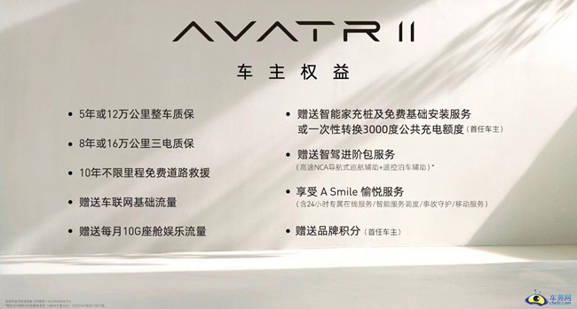 阿维塔011联名限量款,支付9999元定金并成功锁单的购车客户,在阿维塔11的用户权益基础之上,额外享受如下专属权益:赠送每年3,000度公共充电额度(首任车主),赠送智驾高阶包服务(随车):包括高速NCA智驾导航辅助、城区NCA智驾导航辅助、遥控泊车辅助、AVP代客泊车,专享阿维塔零级俱乐部权益(首任车主),赠送MMW联名定制套装8件套(首任车主),赠送高品质隐形车衣1套(首任车主),赠送Fun乐享包(首任车主)。