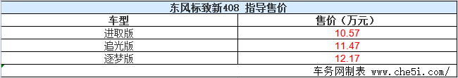 2022年8月21日,东风标致新408正式上市,新车共推出3款车型,售价区间为10.57-12.17万元。同时,原计划于上市当天举办的“索肖派对”推迟,后续将择日进行举办。新车的详细售价如下表: