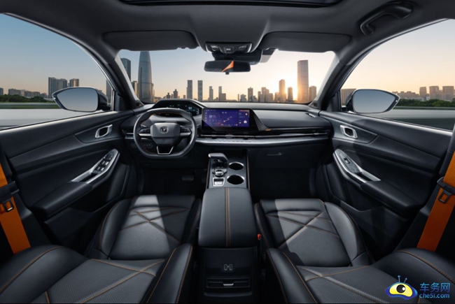 内饰方面,第二代长安CS55PLUS采用了全新的内饰设计。平底方向盘、独特的仪表盘布局以及隐藏式空调出风口,看上去有长安UNI-K的感觉。新车型的内饰视觉感受更简洁,全液晶仪表盘和悬浮式中控屏增强了科技感。而风暴灰限量版车型还采用了活力橙开机动画与主题,并采用全新UI界面设计。