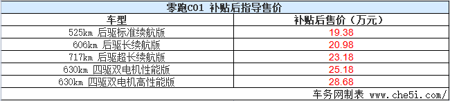 2022年9月28日,零跑C01 正式上市,补贴后售价区间为19.38-28.68万元。作为零跑汽车推出的第4款量产车,零跑C01定位纯电动中大型轿车,CLTC续航里程分别为525km、606km、630km及717km,并配备无电池包CTC技术。详细售价请看下图表
