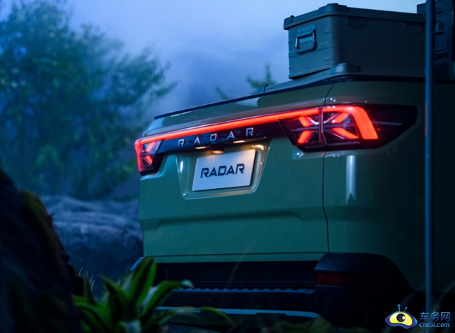 车辆尾部,新车采用贯穿式的LED尾灯,中间带有RADAR的英文标识,尾部制动灯采用X型的造型,比较有亮点,一改此前皮卡以竖置尾灯为主,形象单一的设计。新车尾部货箱的长宽高分别为1525/1450/540mm,此外,由于是纯电动车型,新车还有一个前备厢,尺寸不算小,实用性更强。而从官方视频来看,似乎未来还将有贯穿式尾灯延伸至车斗的版本,更为科幻大胆。另外,其尾厢中还带有最大功率6kW且支持多种输出模式的多功能放电面板。与此同时,新车还配备容量达70L且具备防尘功能的隐藏式收纳前备厢,增强了车辆的实用性。