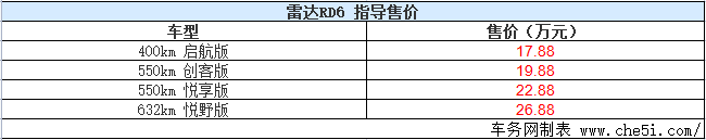 2022年11月9日,吉利控股集团旗下雷达品牌纯电动皮卡RD6正式上市,新车共计推出4款车型,售价区间17.88-26.88万元。RD6是一款基于纯电平台打造的纯电动皮卡,主打多元生活场景的车型,并将在自动辅助驾驶、智能网联、充电补能方面更具优势,新车最长续航632公里,支持120kW快充。新车整车质保4年/10万公里,三电质保8年/20万公里,免费安装家用充电桩,下定5000元抵10000元车款。此外,雷达还将在城市建设超充网络。雷达RD6是基于吉利纯电平台和技术架构打造的纯电平台皮卡,代表了皮卡车型电动化的深入发展。未来,雷达品牌规划推出不少于5款车型,包含中型纯电皮卡、中大型新能源皮卡、全尺寸纯电皮卡、全尺寸新能源越野车、纯电全地形车(ATV)等产品。
