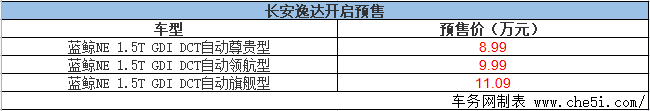 2023年2月20日,长安汽车官方旗下全新轿车——逸达正式开启预售,开启预售的总共3款车型,预售价格从8.99--11.09万元不等。在公布预售价格的同时,长安汽车还公布了包括先享礼、金融礼、置换礼、用车礼、互联礼在内的订购权益。另外,新车定位一款紧凑型轿车,基于方舟架构打造,整体设计采用了长安家族全新的设计理念,造型更加年轻时尚,动力系统将搭载蓝鲸NE1.5T涡轮增压发动机。