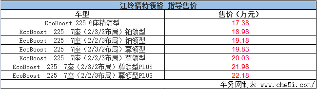 2023年2月24日,江铃福特新款领裕正式上市,新车将推出7款配置车型,售价区间为17.38-22.18万元。新车整体上延续了前款车型的家族式设计风格,并提供外观饰件选装。同时,新车对车内的材质用料也有所升级,并提供6座以及2 3 2和2 2 3两种7座座椅布局车型。详细售价好礼请看下图表: