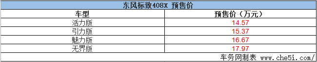 2023年3月21日,东风标致408X正式开启预售,新车共有4款车型,预售价区间为14.57-17.97万元,其将于4月18日开幕的上海车展正式上市。新车定位于中型车,将与雪铁龙凡尔赛C5 X共同基于EMP2 V3平台生产。全系共推出4款配置车型,均搭载1.6T 8AT动力。另外,在公布预售价的同时,东风标致还公布了包括先享礼、金融礼、增值礼、流量礼、狮友礼、无忧礼在内的预售礼遇。