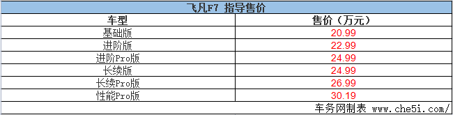 2023年3月27日,飞凡汽车中大型豪华纯电轿车——新豪华大智座飞凡F7正式上市,新车共推出6款车型,售价区间为20.99-30.19万元;其中售价20.99万元的是配备64kWh磷酸铁锂基础版,此版本将于今年下半年正式上市。全车采用以线带面的线条设计理念,整体看上去简洁流畅。新车定位为中大型纯电动轿车,全系标配越级舒适的飞凡巴赫座舱让每一个座位都是C位,配合前所未有的驾享体验,飞凡F7成为主流豪华轿车市场中不容错过的价值首选。