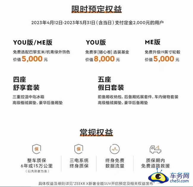 另外,在活动现场,主办方还公布了预定权益。即日起至2023年5月31日(含当日)支付定金2000元,YOU版/ME版可免费选配巴黎玄米/杭青绿外饰色;YOU版免费享【随心卷】选装基金;ME版免费升级19英寸轮毂等。