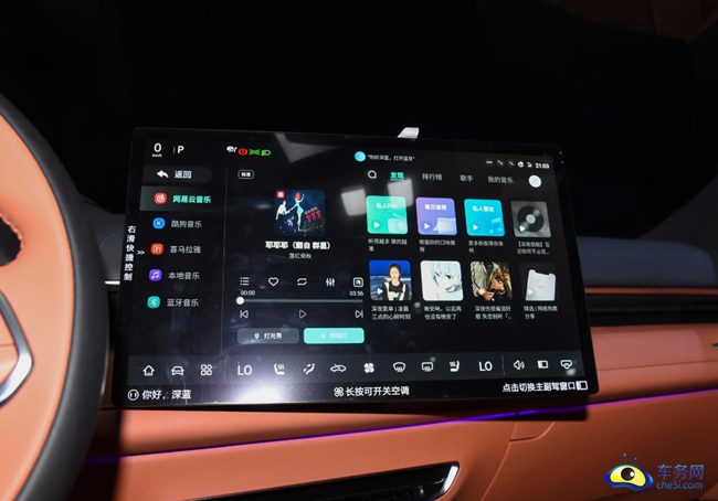 深蓝S7内饰的最大特点就是极简内饰。环抱式座舱设计,增加了游艇式元素,自我掌控的体验感满满。全车传统按键比较少,中央依旧配备悬浮式中控大屏,搭载了高通骁龙8155车规级芯片,并且支持语音交互、手机互联、在线娱乐和APP下载等功能,功能性超全。空调出风口责分别布置在屏幕两侧以及下方,而不是一体连贯式造型。方向盘造型与深蓝SL03基本一致,不过并没有配备仪表盘,另外整体中控台的造型营造出了很强的环抱感。因为可以随意调整角度,这块大屏幕被称为向日葵中控屏,对于驾驶者而言,操作更方便,光线更人性化。