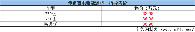 2023年5月21日,中国智电新能源旗舰MPV——广汽传祺智电新能源E9在北京人民大会堂举办上市发布会,开启新篇章。广汽传祺E9正式上市,新车共推出3款车型,官方指导售价区间为32.98-38.98万元。新车作为传祺E系列开山之作,将搭载2.0T发动机与电机组成的插电混动系统,纯电续航136km,综合续航1032km。详细请看下图表: