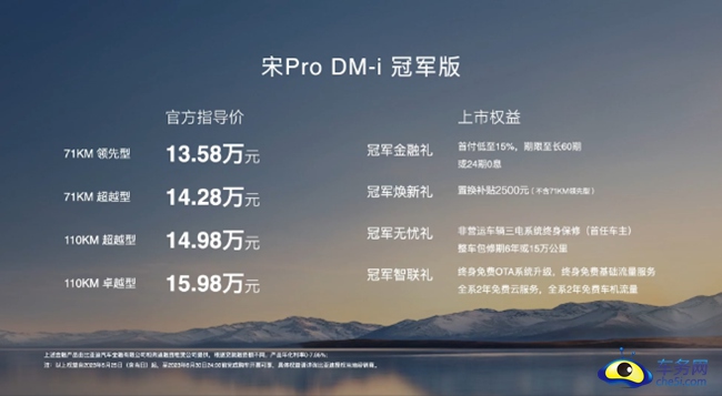2023年5月25日,比亚迪旗下紧凑型SUV——宋Pro DM-i冠军版车型正式上市,新车共推出4款车型,售价区间为13.58-15.98万元。作为冠军版车型,相比现款车型,冠军版车型将采用最新的前脸造型,并增加“远山青”外观配色以及“净月米”内饰配色。另外,冠军版车型还将在配置上进行调整。。同时,该车还将入门款的纯电续航提升到71KM。