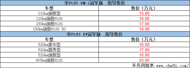 2023年6月19日,比亚迪海洋网重磅冠军车型——宋PLUS冠军版正式上市,其中宋PLUS DM-i冠军版共推出4款车型,售价区间15.98-18.98万元,宋PLUS EV冠军版共推出4款车型,售价区间16.98-20.98万元。新车全系增加天青色、苍烟色全新车身颜色,另外还将提供19英寸双色专属铝合金轮圈等。