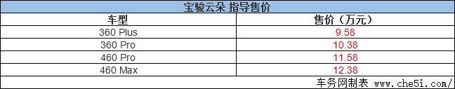 安全层面,宝骏云朵全系标配ABS防抱死&制动力分配系统、ESC电子车身稳定系统、AUTO HOLD自动驻车、HHC坡道辅助功能、蠕行功能、前排正面双安全气囊等安全配置,360 Pro及更高阶车型配备前排侧安全气囊及360°全景影像,460 Max版本配备侧安全气帘。