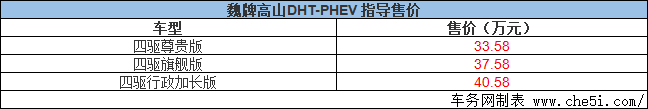 2023年10月18日,魏牌旗下中大型MPV——高山DHT-PHEV正式上市,新车共推出3款车型,售价区间为33.58-40.58万元。其中四驱尊贵版、四驱旗舰版开始陆续交付,四驱行政加长版将于2024年1月启动交付。此外还有一款共创版车型正式亮相,该车采用四座布局,将在豪华和舒适方面进一步升级。高山DHT-PHEV基于高端纯电MPV平台打造,定位面向中高端市场的中大型MPV,搭载1.5T发动机与电机组成的插混系统。