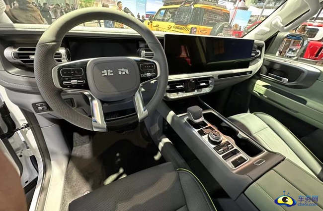 内饰方面,全新北京BJ40的变化也是显而易见的。中控屏与副驾驶娱乐屏形成一体联屏,与内嵌的数字仪表共同构成了三屏联动系统。悬浮式双12.8英寸中控液晶屏 副驾娱乐屏也十分亮眼,尽情体验三指飞屏、无线投屏等功能。车机系统采用高通骁龙8155芯片,操作响应迅速流畅。新车还配备了方向盘电动调节和流媒体内后视镜等配置,大量双拼色皮质材料包裹,让车内的豪华氛围也有所提升。而中控和副驾驶前方的大尺寸悬浮式双联屏也十分亮眼。同时在中控部位保留了一些物理按键。