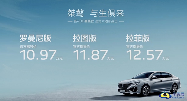 2024年3月18日,标致新408龘龘款正式上市,标致新408龘龘款共推出三款车型,售价为10.97-12.57万元。新车新增了两种外观颜色,在配置方面提升明显,尤其是入门版性价比获得较大提升,此外新车还换装了全新的第四代360THP 1.5T四缸发动。