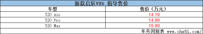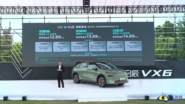 2024年4月20日,新款启辰VX6正式上市,新车共推出3款车型,售价区间为14.19-15.99万元,限时权益价格区间为12.89-14.69万元。新款车型首次推出“不焦绿”版,除了新车色外,配置功能上也有一定升级,空间以及动力方面进行了全方位升级,整体竞争力和性价比也有显著提升。