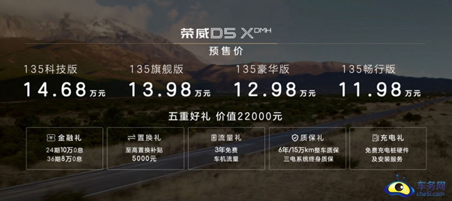 2024年4月25日开幕的北京车展上,荣威D5X DMH正式开启预售。新车共推出4款车型,预售价区间为11.98-14.68万元,购车还可享价值2.2万元的5重礼。作为首款搭载荣威DMH超级混动系统的SUV车型,新车搭载全新的1.5T涡轮增压混动专用发动机,并搭载高效双电机混联驱动。新车CLTC纯电续航里程达到135km,CLTC综合续航里程达1300km。