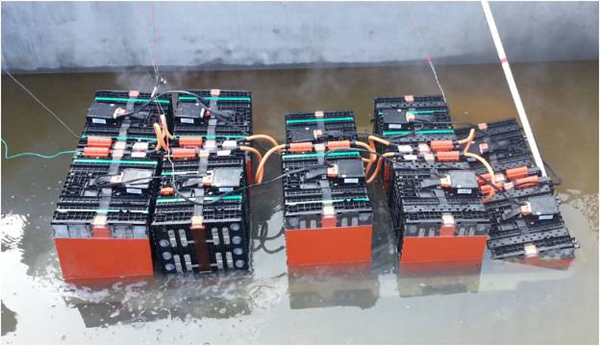 除此之外,如果车辆在雨天遭遇事故或是车主疏于保养,导致电池外壳破损,又让车涉水或是被泡了的话——这样的安全挑战,如何在测试中模拟呢?比亚迪选择剥去动力电池所有的密封保护,再用盐水浸泡,看看电池能不能在浸泡全过程中,甚至浸泡结束后一天之内,都不出现电火花(电弧)。
