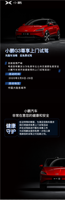 小鹏汽车针对小鹏G3新老车主上线的“把智爱带回家”服务,为用户尽可能提供购车、用车的防护工作及安全保障。此时此刻,小鹏汽车愿与每一位鹏友共克时艰,并肩同行。