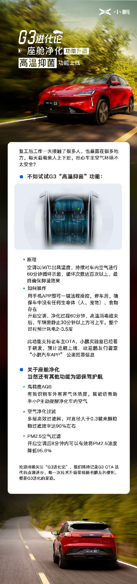 小鹏G3“高温抑菌”功能是通过手机APP一键远程操控,在确保车辆安全的情况下通过G3车内空调系统对座舱进行高温净化。该功能操作简单高效,只需三步:第一步,停好车辆,确保车内没有任何生命体(人、宠物)、食物的存在;第二步,下车并打开手机APP开启高温抑菌功能,这时车内空调将自动升温至56℃,以空调高温大风内循环的方式对车内进行持续60分钟的净化,空气循环达百次以上,确保车内抑菌效果;第三步,功能完成后,静待30分钟后即可上车;整个净化过程预计消耗电量2-3.5度(根据车辆所处环境决定)。同时,该功能区别与其他厂商,无需购买新车,未来,将通过OTA的形式为G3车主进行推送,充分发挥小鹏汽车智能进化的优势。