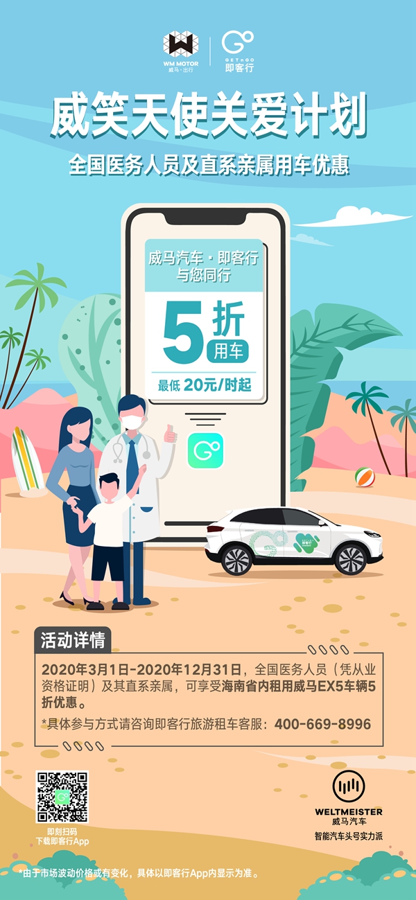 为致敬抗疫逆行的白衣天使,继医疗体系人员购车优惠献礼之后,威马汽车旗下智慧出行品牌即客行再推“威笑天使关爱计划”第二弹:即日起至2020年12月31日,全国医疗体系从业人员及其直系亲属,可享受威马EX5海南租车游的5折优惠。
