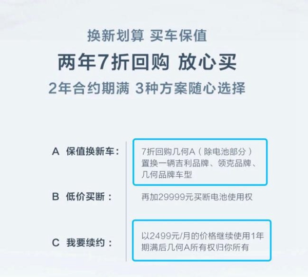 就在“威马直购”模式推出不久,今年3月5日,几何A推出了“两年7折超值回购”计划。与“威马直购”的路数十分相似,几何A这套零售模式也是充分考虑了电动车的残值问题:用户只需签署一份为期两年的出行合约,并支付7.99万元(除电池部分),就可以拥有一台补贴后市场售价为15万元的几何A了。使用两年后,消费者可选择支付29999元一次性买断几何A电池使用权,或选择继续按月支付2499元费用1年,即可拥有所购车辆的完整所有权;如果想换车,也可选择换购吉利、几何、领克旗下任意车型;如果想卖车,官方提供两年7折的保值回购权益。