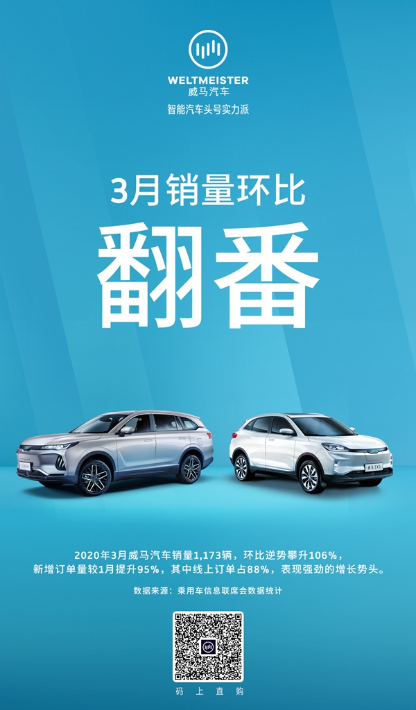 „作为智能汽车头号实力派,威马汽车在疫情期间亦表现出了强劲的增长势头,2月销量逆势增长36%,3月销量再度攀升,环比激增106%,达1,173辆。随着威马直购、 电池租赁方案等创新新零售模式的相继推出,3月,威马用户订单量也再创新高,较1月提升95%,其中线上订单达到88%。